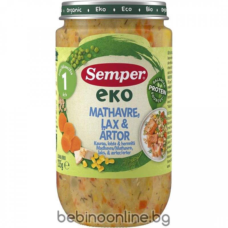 Описание:Semper ЕКО Овес, сьомга и грах 12м. 235г