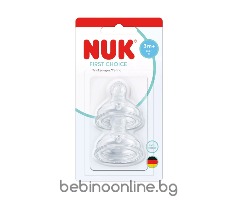 - Биберонът Nuk First Choice се отличава със специалната ортодонтска форма с изключително мек връх, който идеално се вписва в устата на бебето, като симулира колкото е възможно усещането, подобно на това от кърменето, така че повечето бебета почти не забелязват разликата.