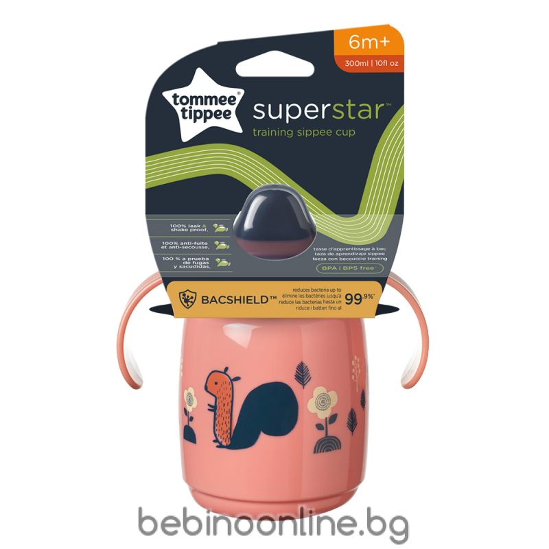 Описание:Тренировъчна неразливаща се чаша Tommee Tippee SuperStar Trainer Sippee Cup с мек накрайник и удобни за хващане дръжки Тази магична чаша Tommee Tippee с обем 300 мл е идеалният начин за развитие уменията на детето за пиене от чаша за възрастни след 6-месечна възраст. Когато сте навън, неразливащата клапа помага да се предотврати бъркотията, а големите дръжки са удобни за хващане даже с една ръчичка!