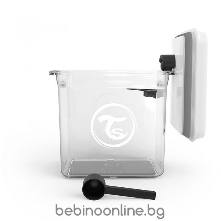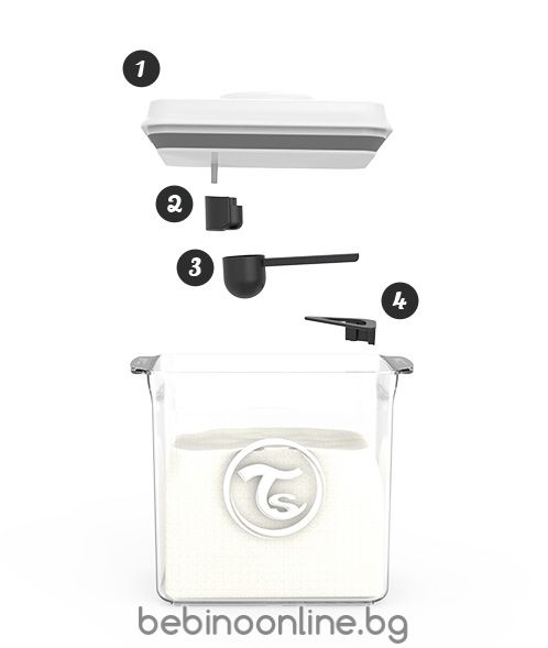Кутия за съхранение на сухо мляко с дозатор от Twistshake – идеална за съхранение на кондензирано мляко за бебета. На пръв поглед – обикновен контейнер за сухо мляко, но както винаги от Twistshake са се постарали да добавят интересни функции. Продуктът е с удобен дизайн и херметически затварящ се капак, който се отваря лесно само с едно щракване. Към него е прикрепена мерителна лъжичка, а самият контейнер има удобен ръб за отстраняване на излишното количество сухо мляко. Това улеснява правилното дозиране. Много е важно да следвате инструкциите за приготвяне на млякото, предназначено за вашето дете. Включената мерителната лъжица е с обем 9.4 мл. – приблизително 4.5 грама. Контейнерът е произведен без използването на BPA-, BPS- и BPF- съдържащи материали, което го прави напълно безопасен Произведен е от висококачествена пластмаса – клас AS и ABS Лесен за отваряне капак – само с едно кликване Контейнерът е в комплект с удобна лъжичка Препоръчва се редовно почистванеХерметически капак Херметически затварящият се капак предпазва сухото мляко от овлажняване и замърсяване с бактерии. Отваряйте и затваряйте капака само с едно щракване. 2 Подвижна щипка Щипката служи, за да се прикрепи мерителната лъжичка към капака на кутията. Може да се използва и като закачалка – позволява да оставите капакът да виси от едната страна на кутията. 3 Мерителна лъжичка Лъжичката е без съдържание на BPA и е удобна за загребване на сухото мляко. Също така се прикрепя много лесно към подвижната щипка, за да ви е винаги под ръка. 4 Изравнителен ръб Отстранете излишното количество сухо мляко от лъжичката чрез подвижния ръб. Почиства се изключително лесно. Вместимостта му е голяма – 1700 m