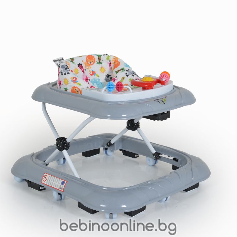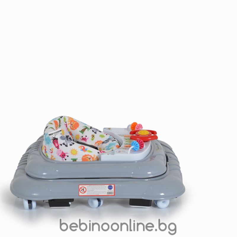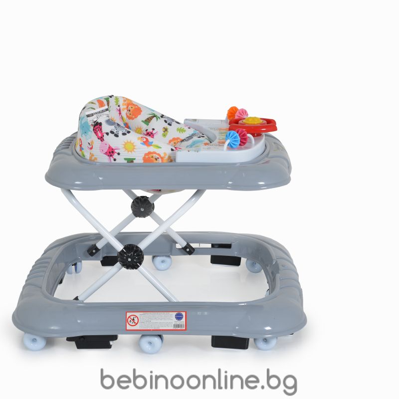 Описание на продукта:Проходилката Jungle fun е чудесен избор за деца на възраст от 6 месеца до достигането им на максимално тегло от 12 кг. Моделът ще задържи вниманието на детето, докато се учи да ходи, със своя интересен дизайн, 3 играчки и 5 бутона с мелодии със светлинна индикация. Нивото на височината се регулира в 3 позиции. Меката седалка и високата облегалка осигуряват комфорт и сигурност. Проходилката е с 8 колелца и 8 стопера за надеждност и безопасност. Когато не се използва, може да се сгъне до компактни размери.