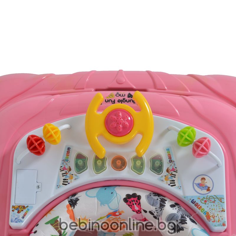 Описание на продукта:Проходилката Jungle fun е чудесен избор за деца на възраст от 6 месеца до достигането им на максимално тегло от 12 кг. Моделът ще задържи вниманието на детето, докато се учи да ходи, със своя интересен дизайн, 3 играчки и 5 бутона с мелодии със светлинна индикация. Нивото на височината се регулира в 3 позиции. Меката седалка и високата облегалка осигуряват комфорт и сигурност. Проходилката е с 8 колелца и 8 стопера за надеждност и безопасност. Когато не се използва, може да се сгъне до компактни размери.
