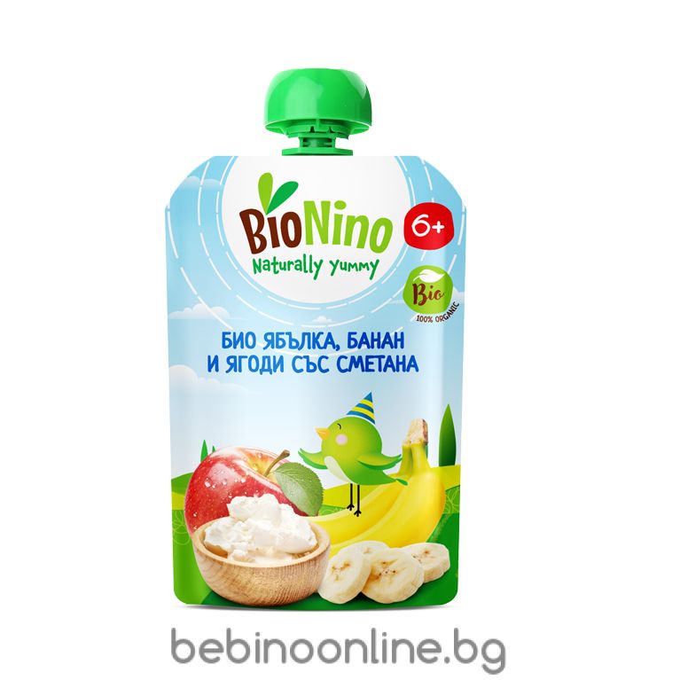 BioNino БИО Плодова закуска ПАУЧ с ябълка, банан и ягоди със сметана 100г.