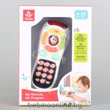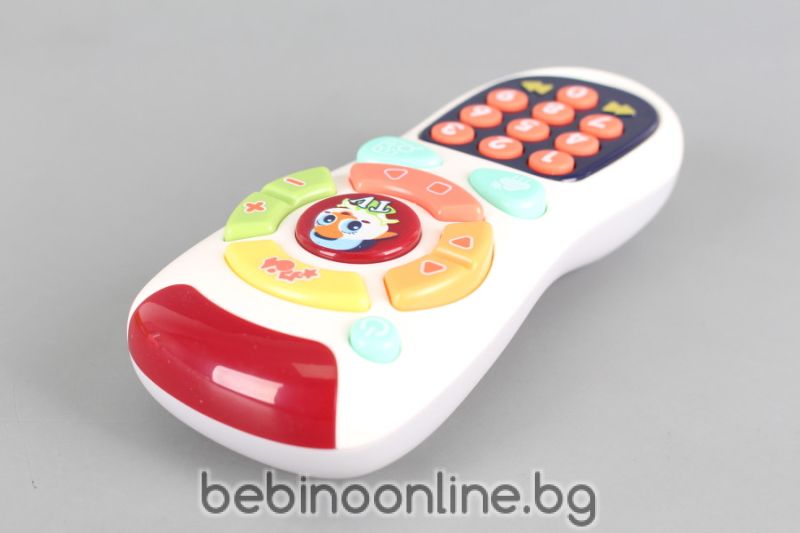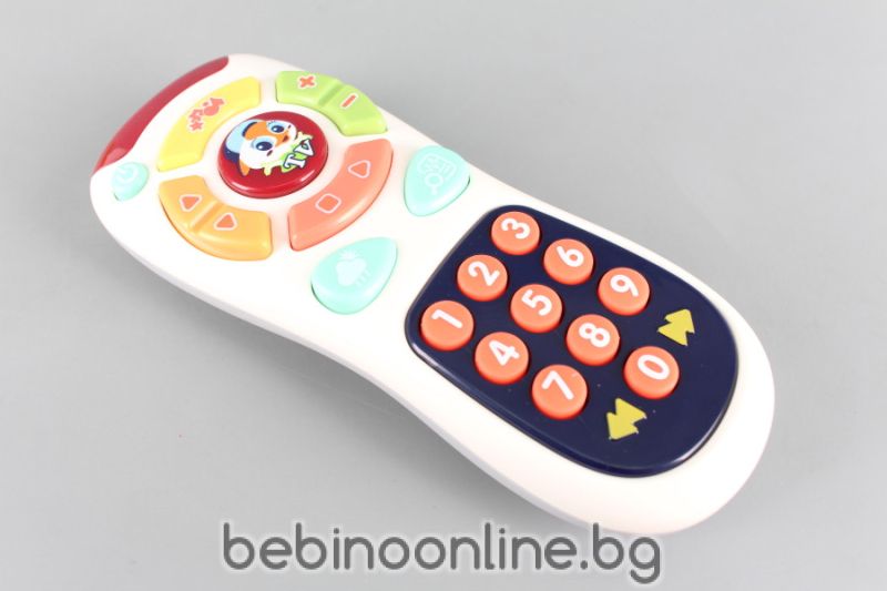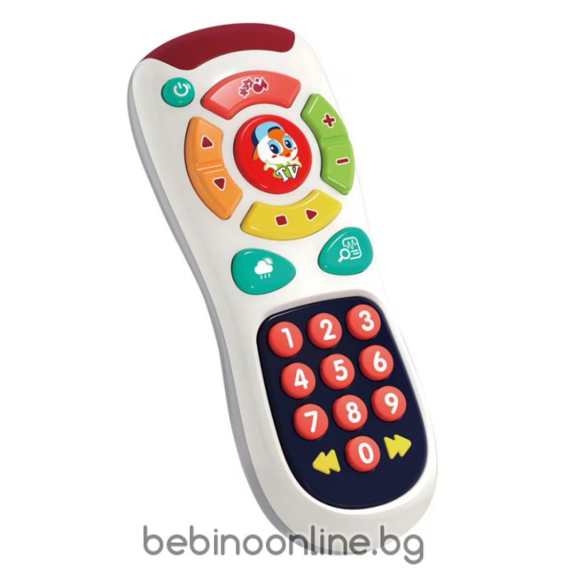 Описание:Моето първо дистанционно управление е музикална играчка, която забавлява бебето и същевременно развива паметта и говорните умения. Всяко дете обича да ди играе с дистанционното на телевизора, а сега то може да има свое собствено. Има различни мелодии, 2 нива на сила на звука, бутон за старт и стоп. Има бутон за прогноза за времето - когато натиснете бутона ще чуете какво ще бъде времето, дали ще бъде слънчево, облачно или ще вали. С бутоните за смяна на каналите, детето ще чува различни думи на английски език.Тази играчка съчетава забавлението с развитието на когнитивните и двигателни умения на детето. Функции: