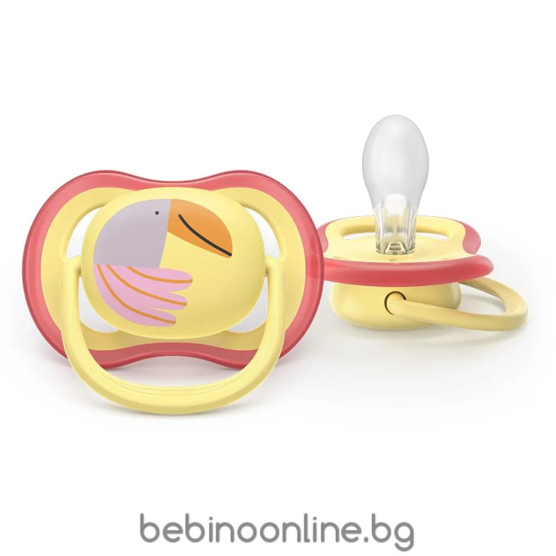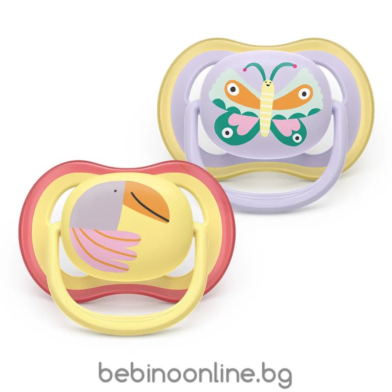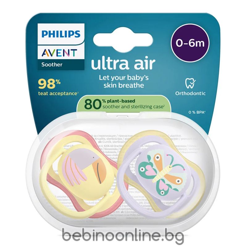 AVENT Ultra Air залъгалки  ортодонтски, силикон, 0–6 м., 2 бр., дизайн папагал/пеперуда, в кутия за стерилизиране 0644.001
