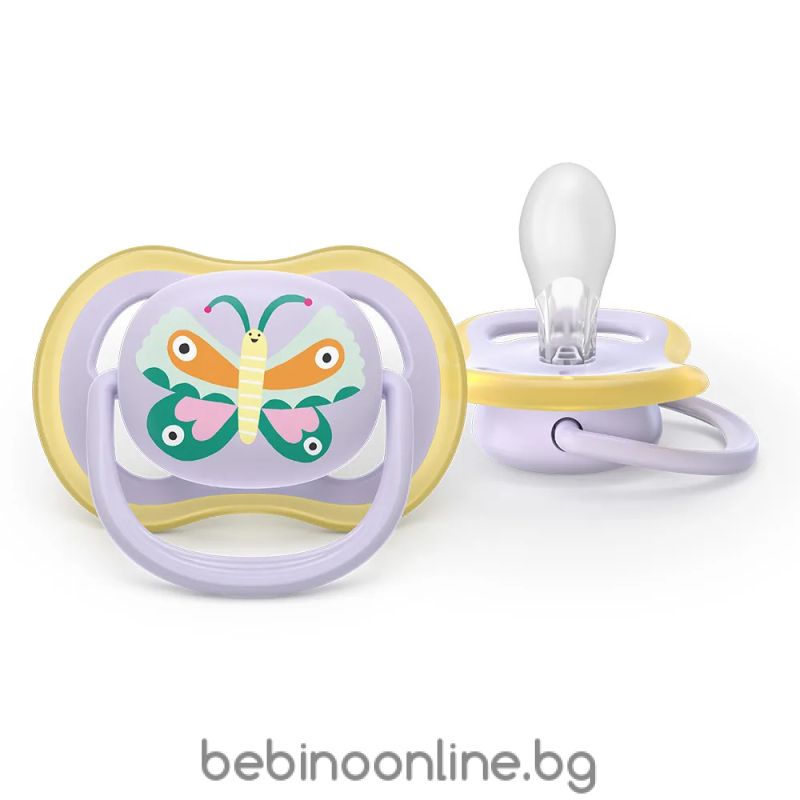 Начало АКСЕСОАРИ AVENT Ultra Air залъгалки ортодонтски, силикон, 0–6 м., 2 бр., дизайн папагал/пеперуда, в кутия за стерилизиране 0644.001