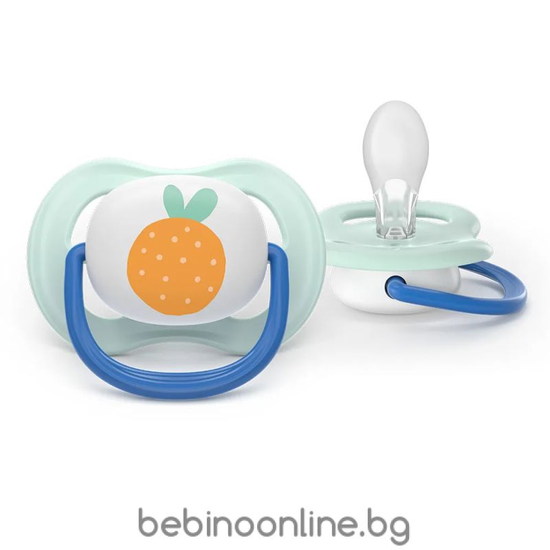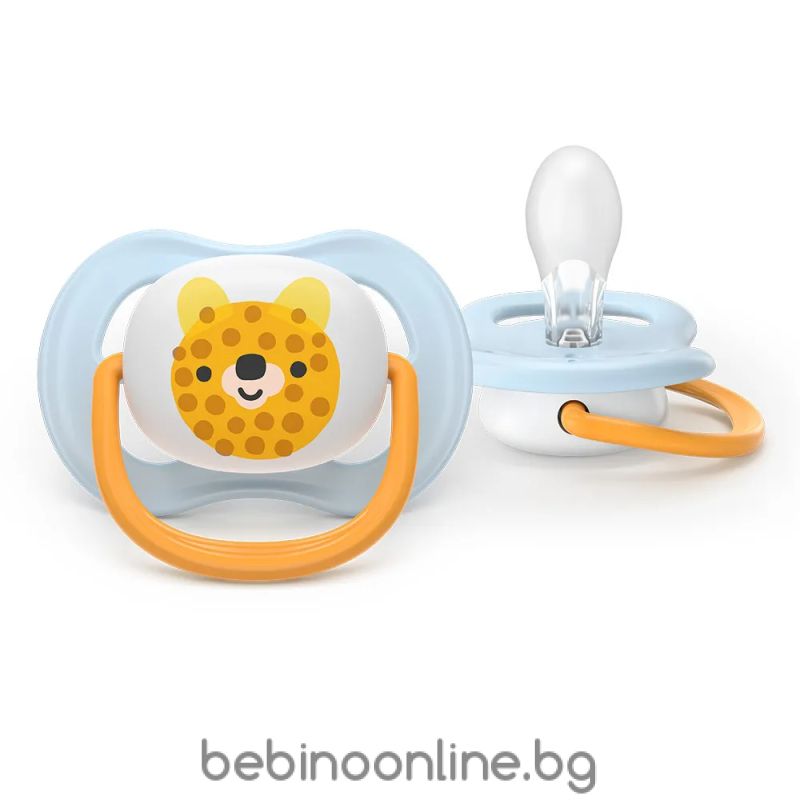 AVENT Ultra Air залъгалки ортодонтски, силикон,Ultra Air Happy, 0-6м, с декорация мече/портокал,0637.001 в кутия за стерилизиране