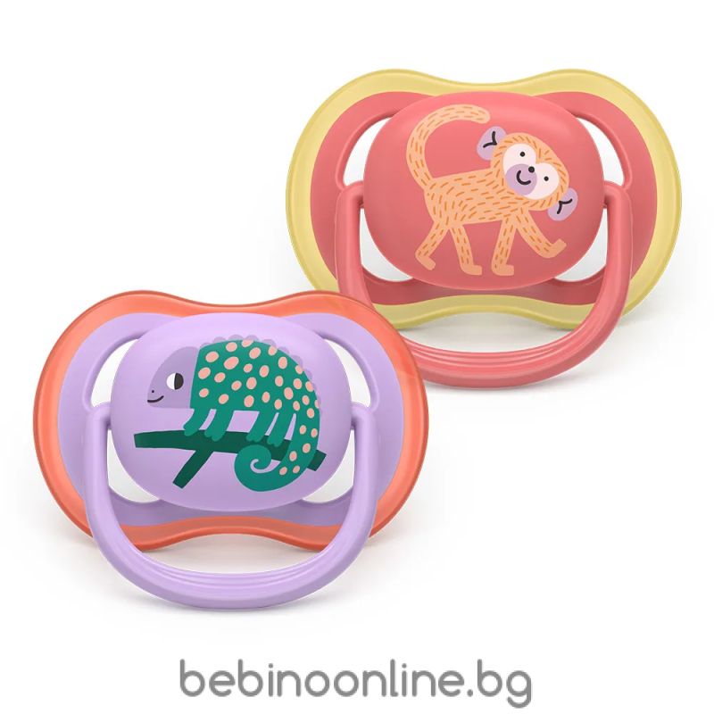 AVENT Ultra Air Happy залъгалки ортодонтски,18м+, с дизайн маймунка/хамелеон, в кутия за стерилизиране 0654.001