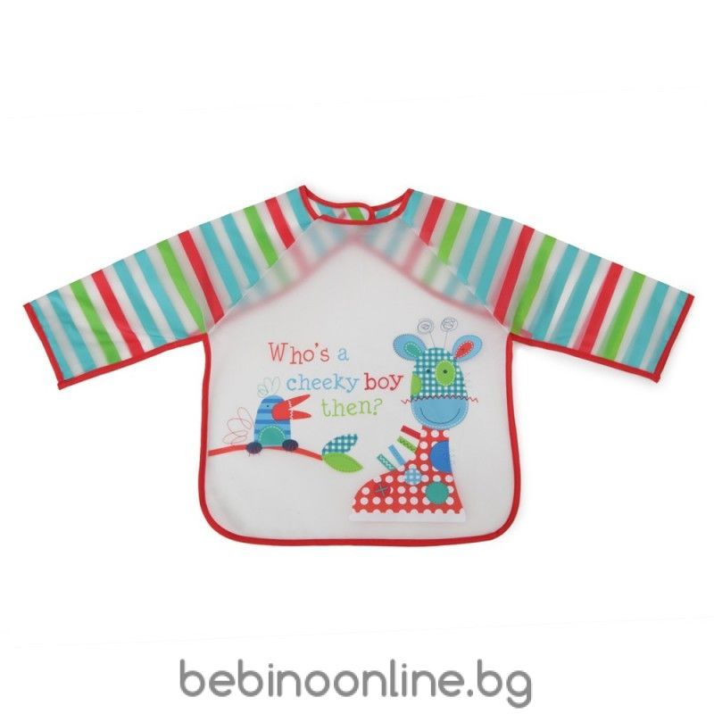 Описание:а Лигавник с ръкави Cangaroo - Messy e подходящ за деца на възраст над 6 месеца, като предпазва дрехите им от петна по време на хранене и игра. Продуктът е водоустойчив. Почистване: Измийте с топла, сапунена вода. Не използвайте силни или абразивни почистващи препарати. Не перете в пералня.